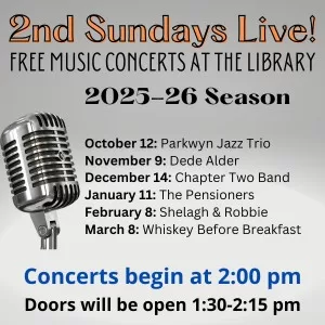 An hour-long free concert! This program is suitable for adults, teens, and families of all ages. Doors are open 1:30-2:15 p.m. If you need special accommodations or have any questions, please contact Library Ambassador Karen Woodworth at (269) 343-7747, ext. 204 in advance of the concert you plan to attend.