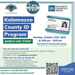 The Kalamazoo County ID Mobile Unit will be at the library to issue county IDs, renew county IDs, and answer questions about county IDs. Click HERE for more information on documents needed to receive a county ID. The cost is $10 with scholarships available upon request.