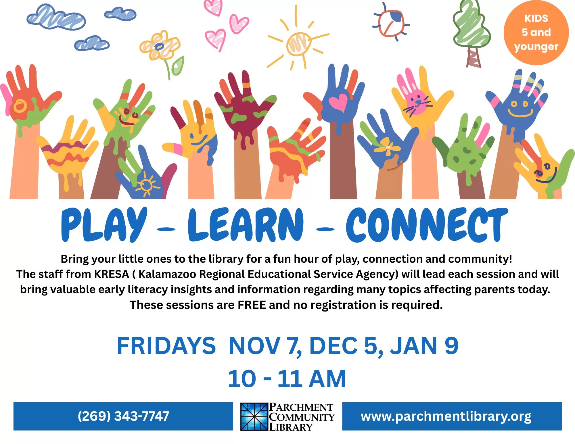 Parents and caregivers, bring your little ones for a fun hour of play, connection and community. The staff from KRESA (Kalamazoo Regional Educational Service Agency) will be hosting each session and bringing valuable early literacy insights and information regarding many topics affecting parents/caregivers today.
