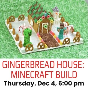 Let’s build Minecraft-style! Using graham crackers, candy, and sugar “blocks,” make your own holiday Minecraft house to take home. Supplies and snacks provided by the library!