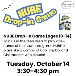 Join us in the teen area to play a few hands of the new card game NUBE! It’s like Uno, Skipbo, and Charades combined. Nube is Spanish for clouds, and clouds are the theme of the game – you might even learn about clouds while you play!