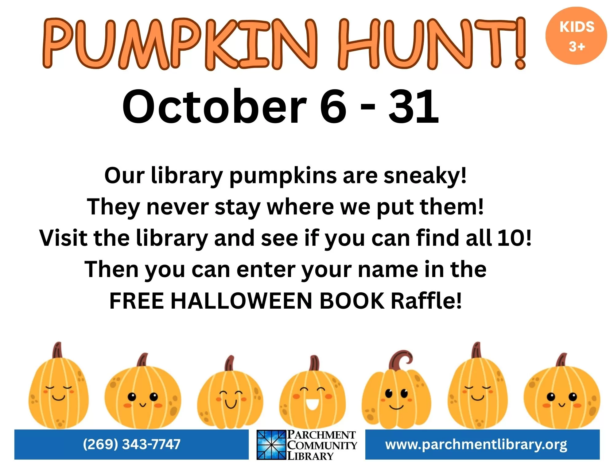 Pumpkin Hunt begins today AGES 3+ Our library pumpkins are sneaky! They never stay where we put them! Visit the library and see if you can find all 10! Then you can enter your name in the FREE Halloween Book raffle. + Add to Google Calendar + iCal / Outlook export Date Oct 06 2025 Time 9:00 am - 7:00 pm Share this event